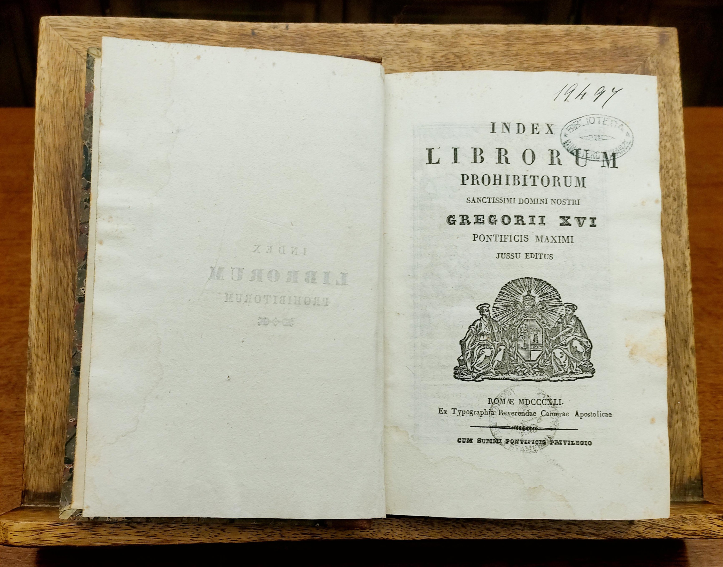 | Index LIBRORUM Prohibitorum SANCTISSIMI DOMINI NOSTRI Romae MDCCCXLI Stampato sotto il pontificato di Gregorio XVI, questo volume del Index Librorum Prohibitorum non è soltanto un elenco di titoli proibiti: è un oggetto che racchiude il potere di un’epoca, il timore del pensiero libero e la volontà di sorvegliare l’immaginazione. La sua impaginazione solenne, il sigillo della Reverenda Camera Apostolica, l’iconografia pontificia al centro della pagina: ogni elemento parla di autorità, ma anche di una bellezza formale che oggi ci appare paradossalmente seducente. Sfogliarlo è come entrare in una biblioteca capovolta, dove i libri non si cercano per leggerli, ma per evitarli. Eppure, proprio questo divieto accende la curiosità: ogni autore censurato diventa una voce da riscoprire, ogni titolo proibito una promessa di libertà. In un tempo in cui leggere poteva essere un atto sovversivo, l’Indice si trasforma oggi in una mappa del desiderio.